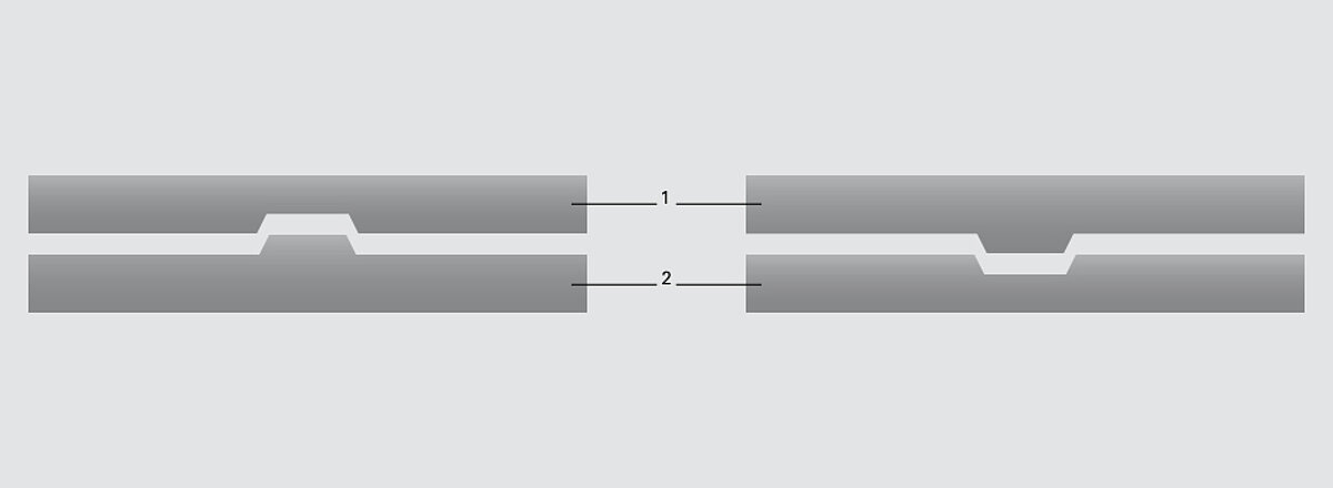 Ausgehend von der bedruckten bzw. geprägten Seite des Materials handelt es sich beim Embossing (links) um eine Hochprägung (die geprägten Flächen sind erhaben) und beim Debossing (rechts) um eine Tiefprägung (die geprägten Flächen sind vertieft). Beide Prägungen werden durch Einsatz eines Sets zweier Zylinderarten erzeugt, dem Matrizenzylinder und dem Patrizenzylinder. Der Matrizenzylinder drückt den Bedruckstoff auf den Patrizenzylinder. Beim Embossing trägt der Matrizenzylinder die Vertiefungen und der Patrizenzylinder die erhabenen Prägeelemente. Beim Debossing ist es genau umgekehrt.