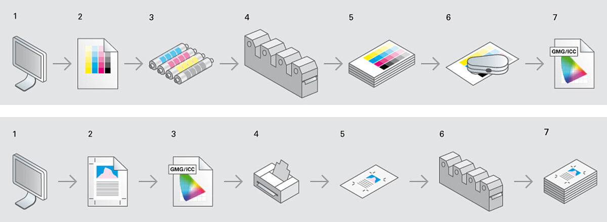 1 Reihe unten: 1 Workstation, 2 Druckdaten, 3 digitales Profil anwenden, 4 Ausdruck auf einem Proofer, 5 Druckergebnis, 6 Druck in der Druckerei, 7 Druckergebnis Druckerei = Druckergebnis Proof