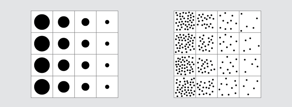 Bild links: Bei der autotypischen Rasterung werden Tonwerte durch die unterschiedlichen Größen der Rasterpunkte erzeugt. Ihre Mittelpunkte sind immer gleich weit voneinander entfernt. Je nach Größe bedecken die Rasterpunkte einen bestimmten Teil einer Bildstelle und erscheinen so optisch heller oder dunkler.