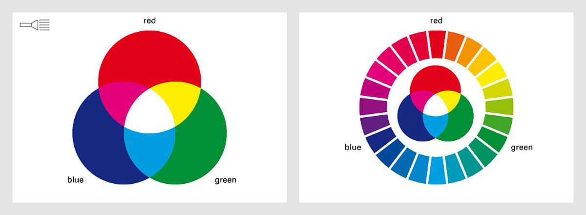 Das additive RGB-Farbmodell wird bei Farbbildschirmen und anderen selbstleuchtenden Systemen sowie bei Scannern und Digitalkameras eingesetzt. RGB-Farben entstehen durch das Mischen von farbigem Licht. RGB (englisch red, green und blue) steht dabei für die drei Grundfarben Rot, Grün und Blau. Ein Farbton lässt sich präzise durch den jeweiligen Anteil dieser Farben definieren, sofern ein spezifisches RGB angegeben ist. Üblich sind z.B. Adobe-RGB, ECI-RGB, sRGB. Diese RGB-Farbräume unterscheiden sich auch in der Größe des Farbraums, so ist z.B. ECI-RGB um ca. 60 Prozent größer als sRGB. Jeder Farbanteil kann zwischen 0 und 255 variieren. Bei gleichen Anteilen von Rot, Grün und Blau ergibt sich je nach Wert eine Farbe zwischen Weiß und Schwarz. Mischt man je zwei der Grundfarben zu gleichen Teilen, entstehen die Grundfarben des subtraktiven Farbmodells CMYK.