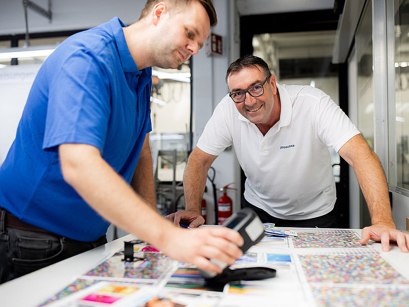 Colours are no longer just a visual effect. Today they are measurable, defined values. To get perfect printing results, Janoschka uses their extensive know-how to coordinate the interaction of up to seventy variables. These include the various makes of printing ink with their different solvents, pigments and properties, the range of substrates (aluminium, a variety of plastics, paper etc.); the printing tools with their screens, angles and gradations; all the way to the printing presses themselves, with their varying parameters, such as counter-pressure, speed etc.