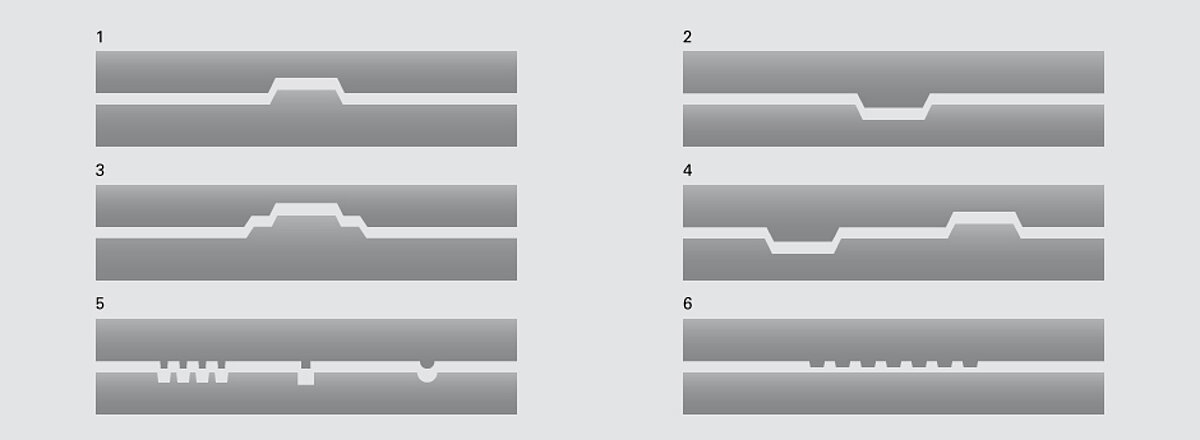 A distinction is made between high embossing / debossing and blind embossing. Whereas a set of two types of cylinders which fit into each other exactly is produced during embossing and debossing, with blind embossing there is only one embossing cylinder, which pushes the printing substrate against a flat cylinder. The embossing is produced here by compression and not through plastic deformation. Two other embossing options include hot foil stamping, which builds up an effect foil via heated elements and on the other cold foil stamping whereby an adhesive lacquer is printed on the substrate and then an effect foil is transferred to a printing lacquer.