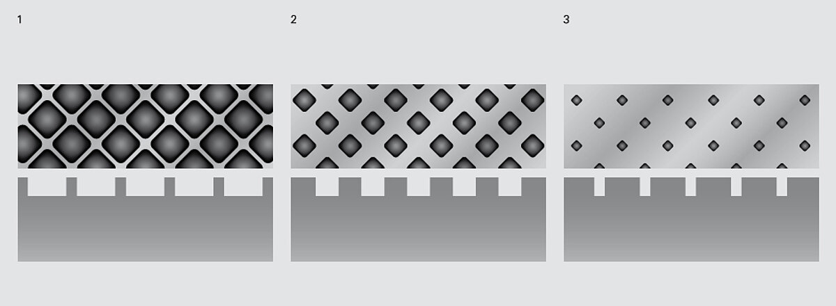 Laser etching is a traditional imaging process for gravure cylinders. Similarly to electro-mechanical engraving or laser engraving, the cylinder is copper-coated before etching. A further layer of UV sensitive lacquer covering with a thickness of 4µ – 10µ depending on the etching depth, protects the cylinder during the etching procedure at the axes and front sides. The corresponding image is transferred to the cylinder being coated by using a Digilas laser from 40 watt and with up to four beams. By etching with ferrous 3 chloride after the laser procedure, the cells are deepened and widened, without the covering layer dissolving in the process. The cylinder can be chromed after the covering layer is removed form the surface, front side and axes. The geometrical shape of the cell during etching is quadratic and screening ranges from a 70 screen to a 120 screen. In the case of special applications coarser screens (20) or also finer screens (160) (e.g. during security printing) can be used. The standard angular position (-> screen angle) in etching is 45°, but other angles are always possible. In contrast to direct laser, the Digilas Laser operates on a standard basis with several shots for a cell. As a result a large bandwidth is created in the cell geometry, e.g. cushion screen, honeycomb screen, special screen.